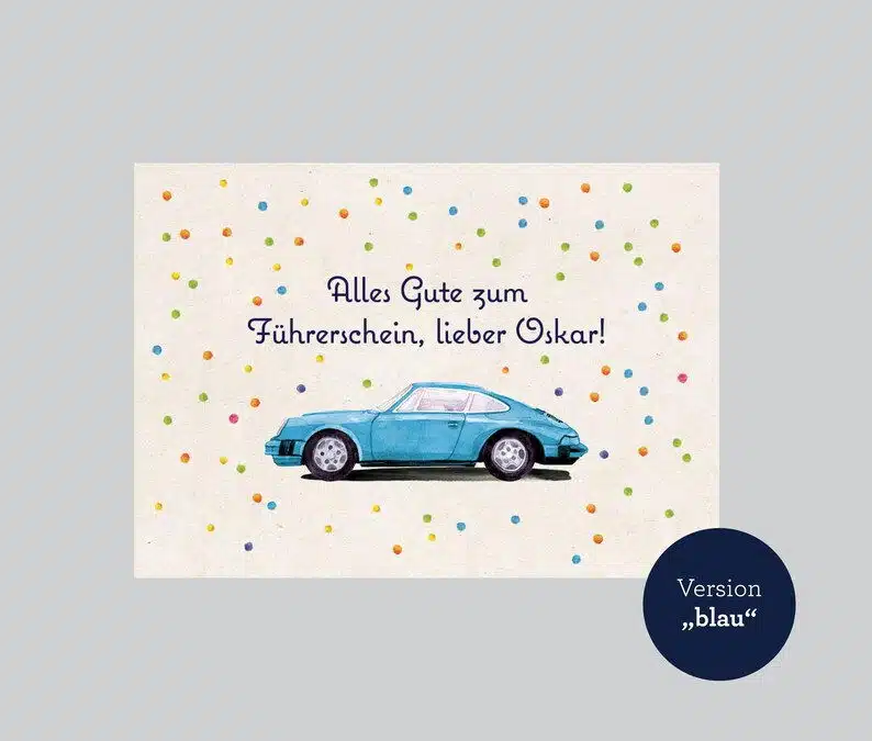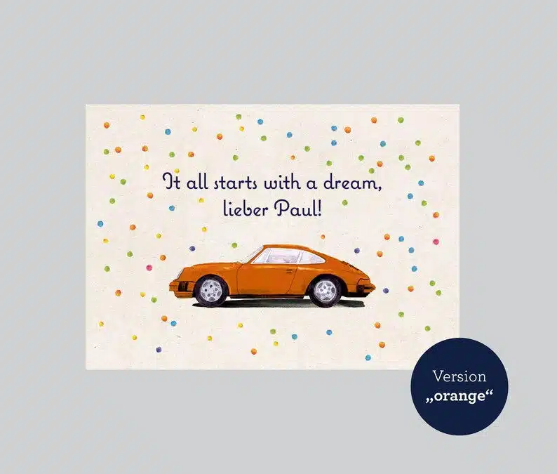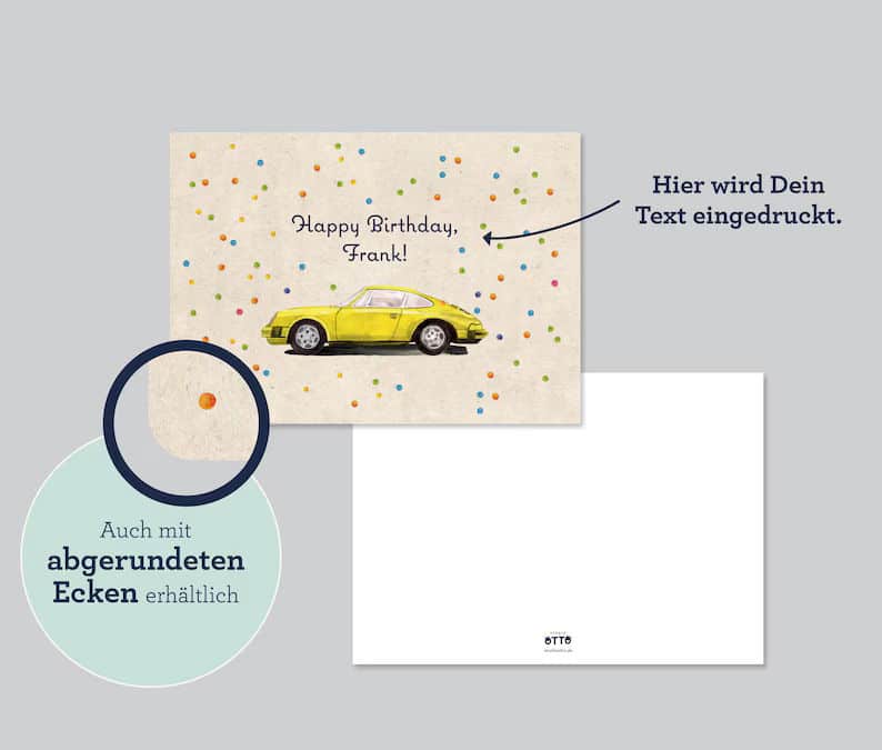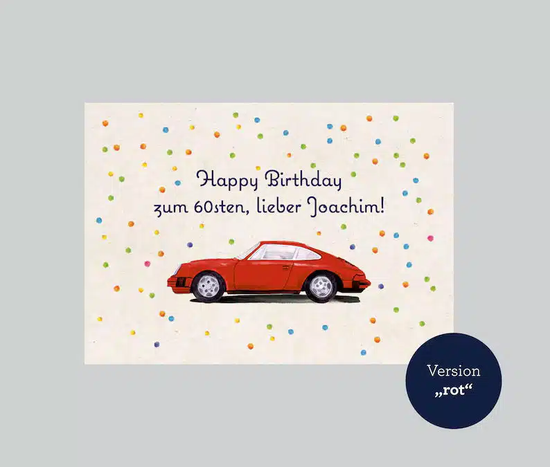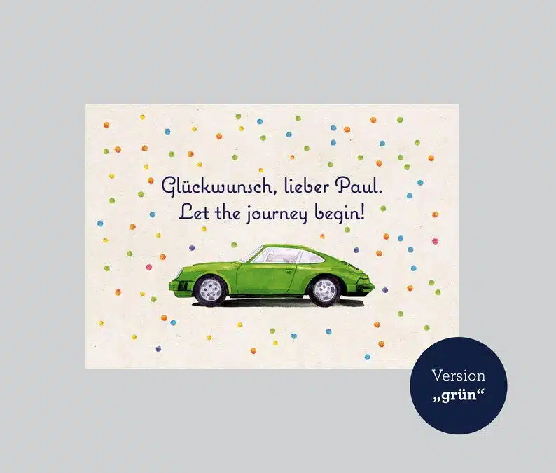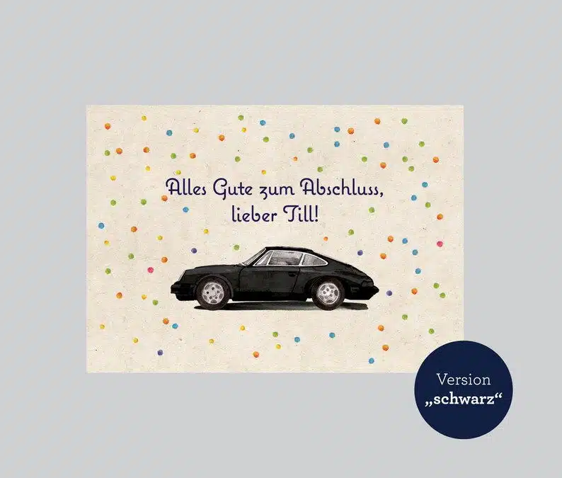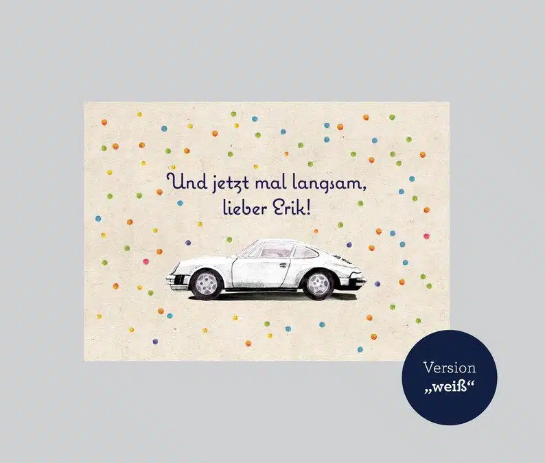 Ob Geburtstag, Jubiläum, Prüfung bestanden oder der unvergessliche Moment des ersten eigenen Porsche: Mit einer individuell gestalteten Karte verleihst du jedem Anlass einen Hauch von sportlicher Eleganz und echter Leidenschaft. Kombiniert mit deinem Wunschtext entsteht ein einzigartiges Erinnerungsstück, das Emotionen weckt und garantiert einen Ehrenplatz bekommt.