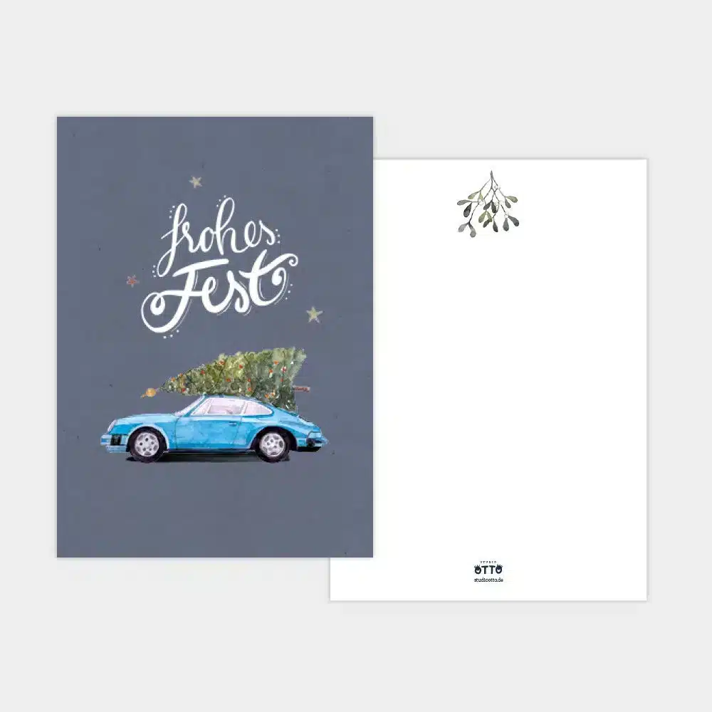 Weihnachtskarte mit dem Motiv „Blauer Porsche 911“