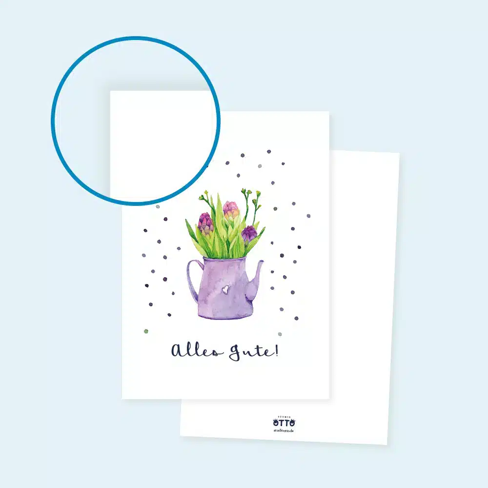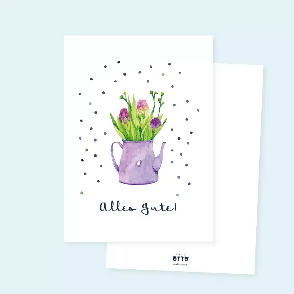 Die Illustration ist eine Aquarellzeichnung mit Details aus Farbstiften. Liebevoll und per Hand gezeichnet, wie alles aus dem Studio Otto. Die Zeichnung wurde eingescannt, digital nachberbeitet und dann gedruckt auf 300 g/m² Chromokarton (Rückseite ungestrichen, deswegen sehr gut zu beschriften). Die Rückseite ist bis auf das Logo mit URL (ganz unten, klein und dezent) unbedruckt und lässt jede Menge Platz für liebe Worte.