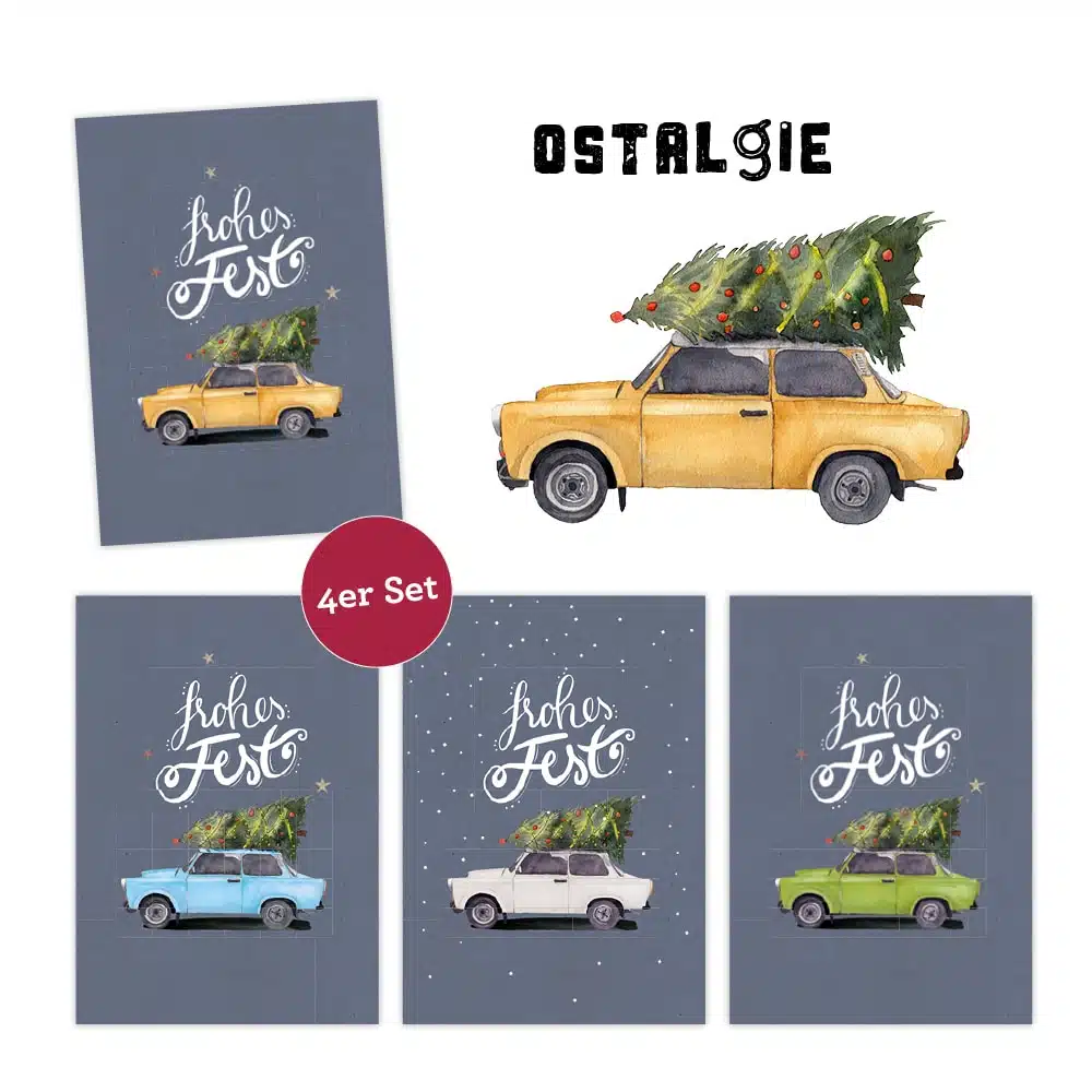 Driving home for christmas – dieses Jahr im Trabi! Hier ist die perfekte Weihnachtskarte für den echten Sachsenring-Fan. Ein Set aus 4 Karten (je eine in den Trabifarben panamagrün, ahorngelb, togaweiß und gletscherblau) lässt das Trabiherz mehrere Umdrehungen zulegen. Eine für die Mama, eine für den Papa, eine für den Schrauber des Vertrauens und eine für den TÜV-Mitarbeiter?